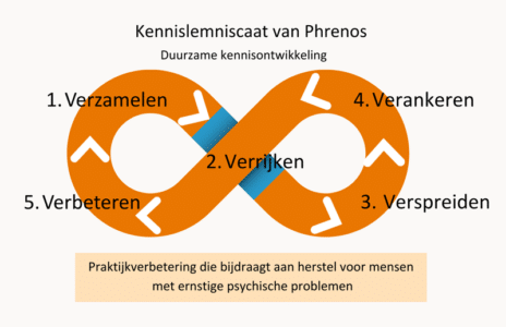 Phrenos verbindt praktijk en onderzoek. Onze werkwijze laat zich het best begrijpen als een lemniscaat: een voortdurende wisselwerking waarin praktijkervaringen en kennisontwikkeling elkaar steeds opnieuw versterken. De 5 V’s van kennisontwikkeling vormen daarbij geen lineair stappenplan, maar een cyclisch proces. Zo organiseren wij collectief leren en zorgen we dat kennis niet op papier blijft, maar daadwerkelijk bijdraagt aan herstel en kwaliteit van leven van mensen met ernstige psychische problemen.