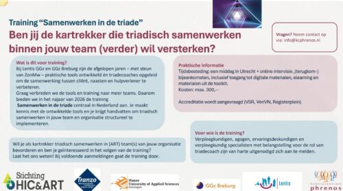 Wil jij als kartrekker triadisch samenwerken in (ART) team(s) van jouw organisatie bevorderen en ben je geïnteresseerd in het volgen van de training? Meld je aan door een mail te sturen naar info@kcphrenos.nl. Bij voldoende aanmeldingen gaat de training door. Er is ruimte voor twaalf deelnemers.